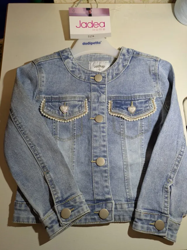 Dettagli del prodottoGiacca in denim per bambina, taglia 3/4 anni. Modello con colletto tondo e chiusura a bottoni.