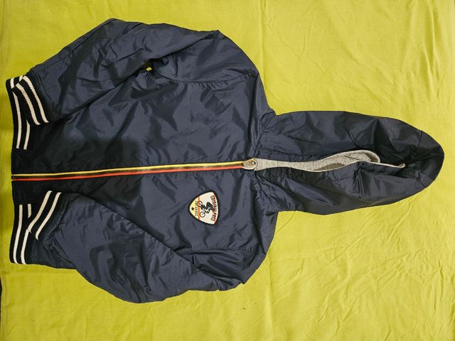 Giacca reversibile per bambino, taglia 10. Usata poco, in ottime condizioni. - Colore blu scuro. - Cappuccio integrato. - Chiusura con zip. - Dettagli a righe sui polsini.