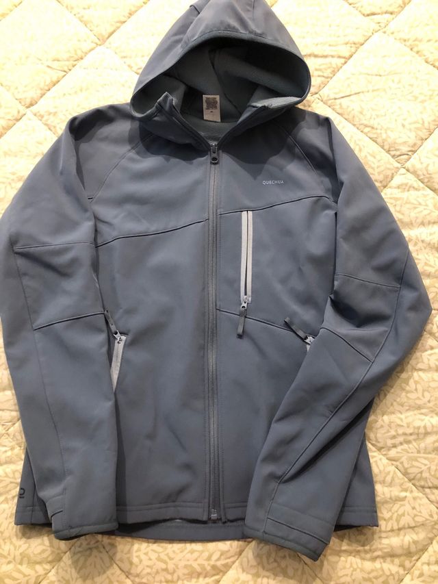Giacca tecnica Quechua per bambino, adatta per età 12-13 anni. - Colore grigio/blu. - Zip frontale. - Cappuccio. - Tasche con zip.