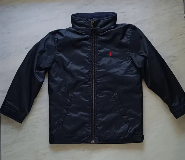 Giacca a vento da bambino firmata Polo Ralph Lauren. Bellissimo giubbino con interno in pile ed esterno impermeabile. Cappuccio a scomparsa nel colletto. Logo tipico del marchio all' altezza del petto . Bottoni a pressione firmati in vita e sui polsini per regolare la vestibilità. Due tasche in vita ed un taschino interno.