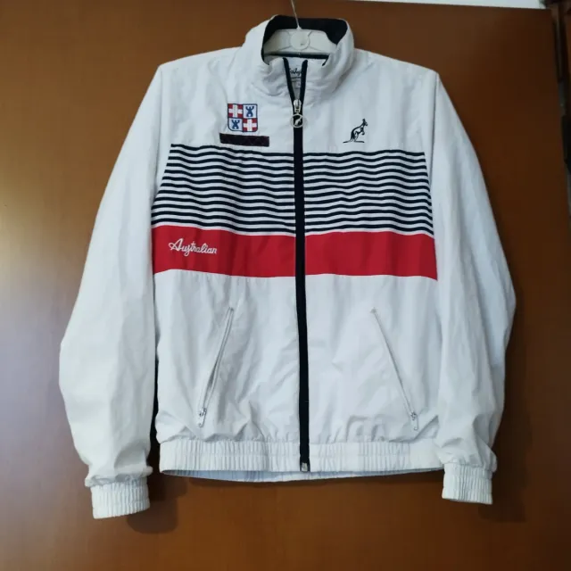 Dettagli del prodottoGiacc felpa tuta da ginnastica vintage Australian by L'alpina, chiusura con zip e tasche con zip. Unisex. Colore base bianco, con dettagli rossi , beri e blu. Taglia bambino L, taglia donna S. Ottime condizioni.