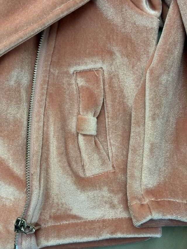 Giacchetta per bambina in morbido velluto rosa, perfetta per un tocco di stile. - Tessuto in velluto. - Dettaglio fiocco sulla tasca. - Chiusura con zip.