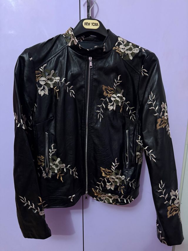 Giacchetto Biker Nero con Ricami Floreali