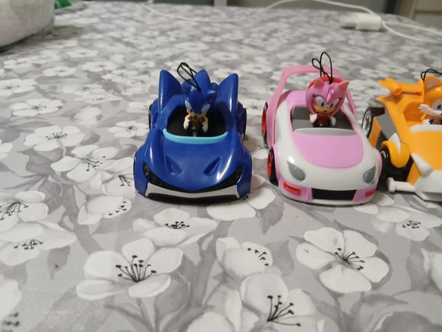 Set di giocattoli da collezione. - Personaggi a tema corse. - Veicoli colorati.