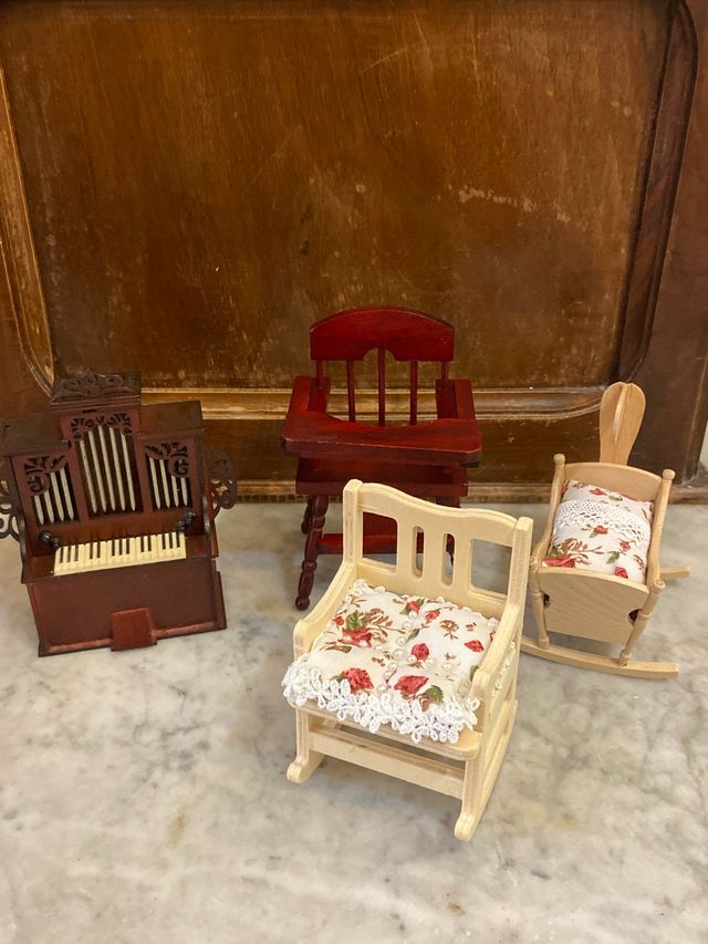 Dettagli del prodottoSet di mobili in miniatura in legno per bambole.