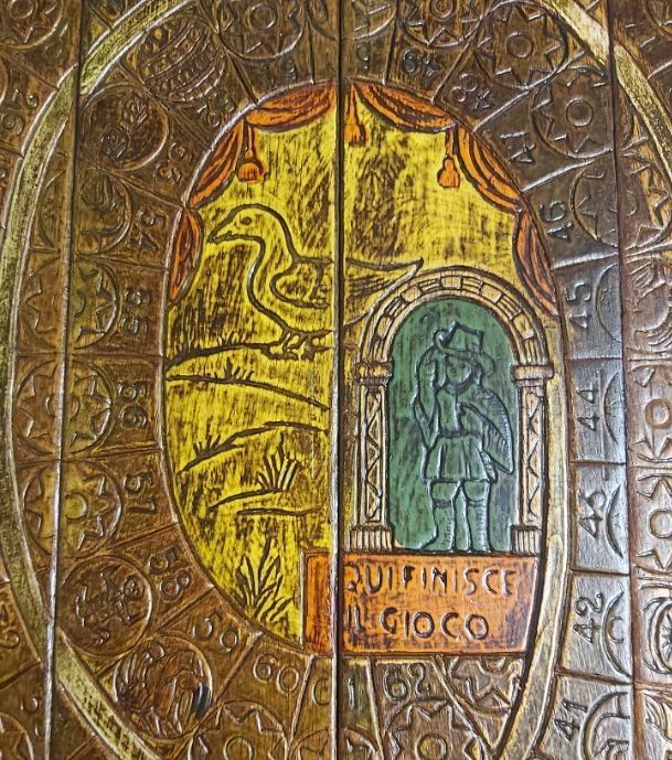 Gioco dell'Oca in Legno Pieghevole Dichiarazione dell'Oca Perugina DO600. Riproduzione di un gioco dell’Arte Popolare del ‘600. La tavola da gioco si piega grazie a 12 cerniere in ottone e si chiude per mezzo di una chiusura in ottone. Sulla tavola da gioco in basso la scritta “Il vero giocar dell’oca”. Alla casella 63 la scritta “Qui