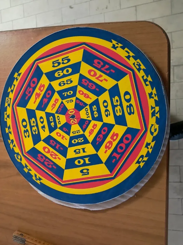Dettagli del prodottoGioco da tavolo Ragnatela per freccette. Il tabellone presenta un design a ragnatela con diverse zone di punteggio.