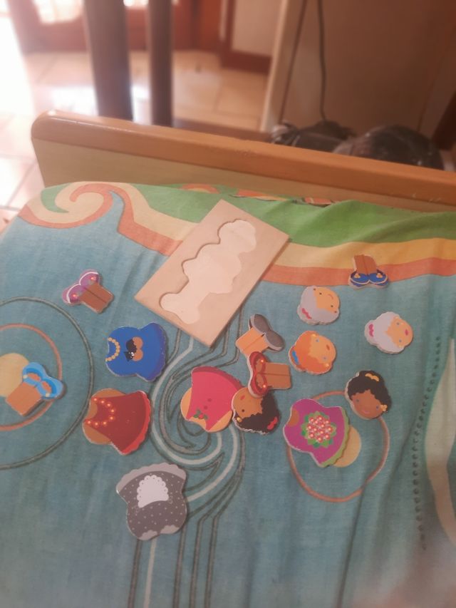 - Contiene diversi pezzi colorati a forma di vestiti e personaggi.