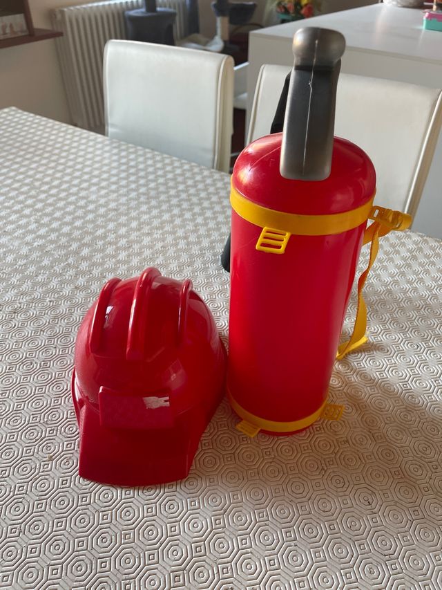 Set gioco da pompiere con elmetto e estintore. - Elmetto rosso. - Estintore rosso con dettagli gialli e manico grigio.