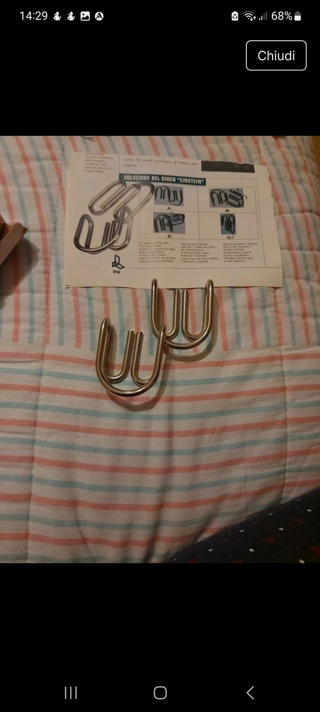 Rompicapo metallico Einstein con foglio illustrativo. - Due pezzi metallici intrecciati. - Istruzioni incluse per la soluzione.