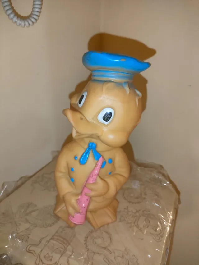 Un simpatico gioco vintage a forma di Paperino, con un tocco di colore dato dal cappello e dal fiocco blu. Materiale plastico.