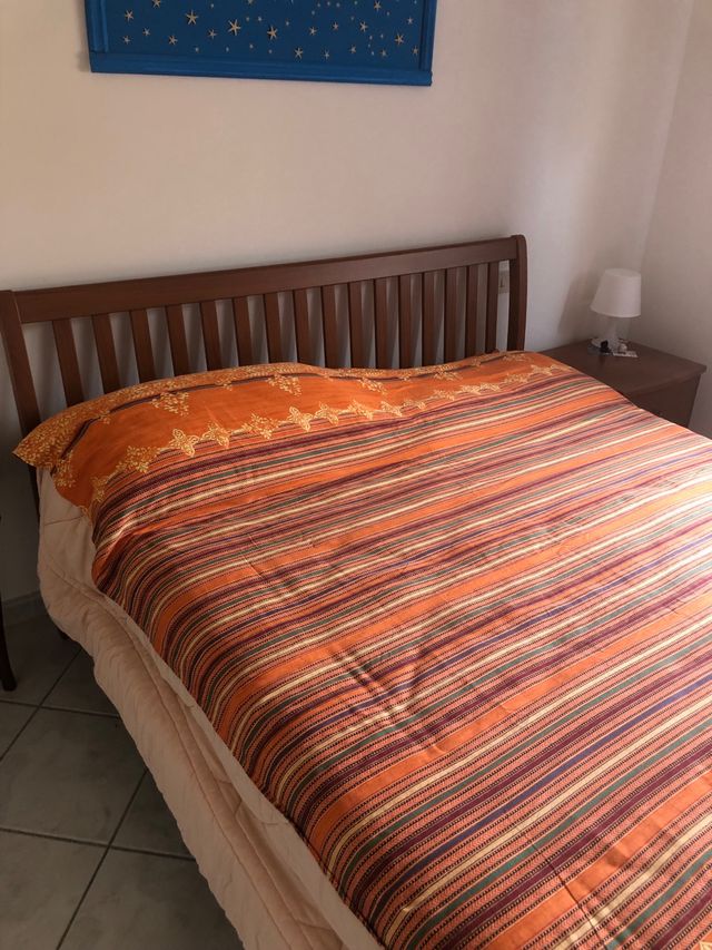 Giro letto con testiera in legno, con rete con piedini e doghe in legno, in regalo un comodino come in foto