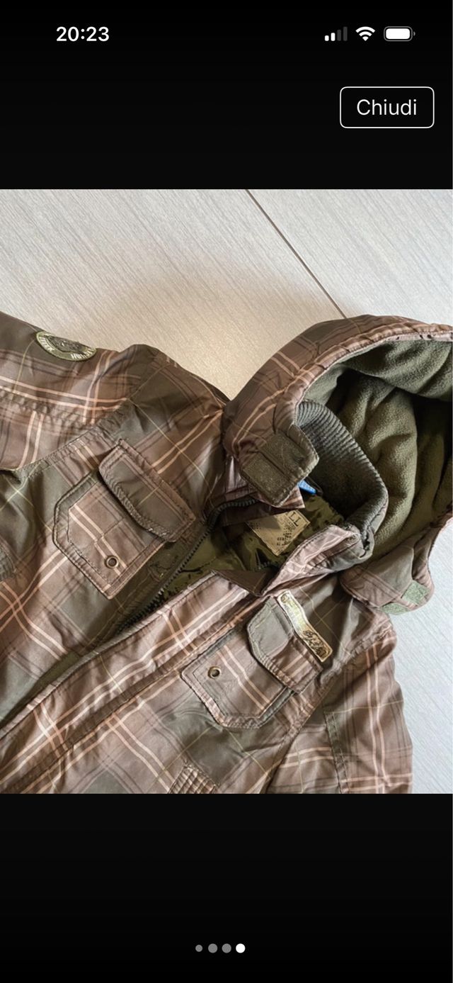 Giubbino a quadri per bambino, taglia 4/5 anni. Ideale per le giornate più fresche. - Fantasia a quadri marrone e bianca. - Cappuccio foderato. - Tasche frontali con patta.