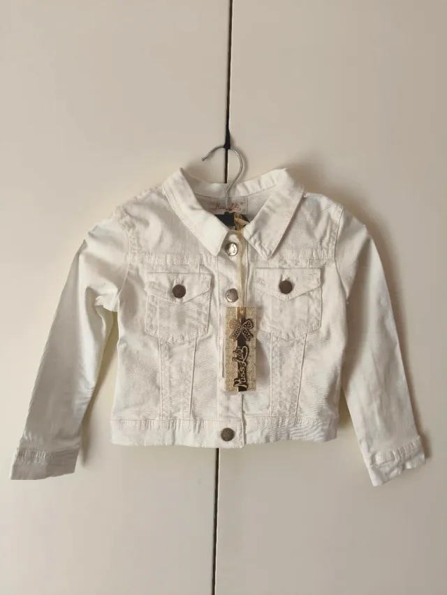 Bellissimo giubbino in denim bianco per bambina. Con chiusura a bottoni e due tasche al petto