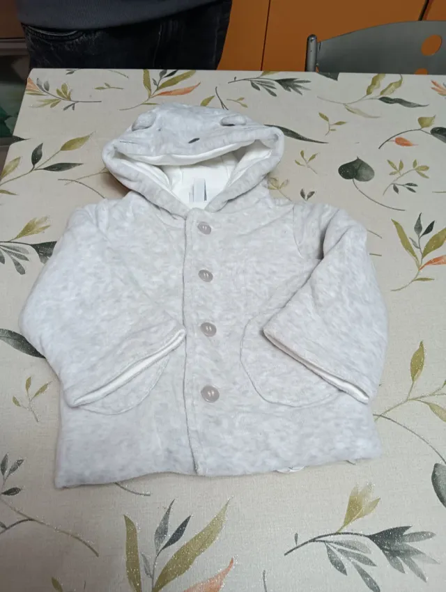 Morbido giubbino per neonato con un simpatico cappuccio. - Chiusura con bottoni. - Tasche frontali. - Fodera interna in cotone.