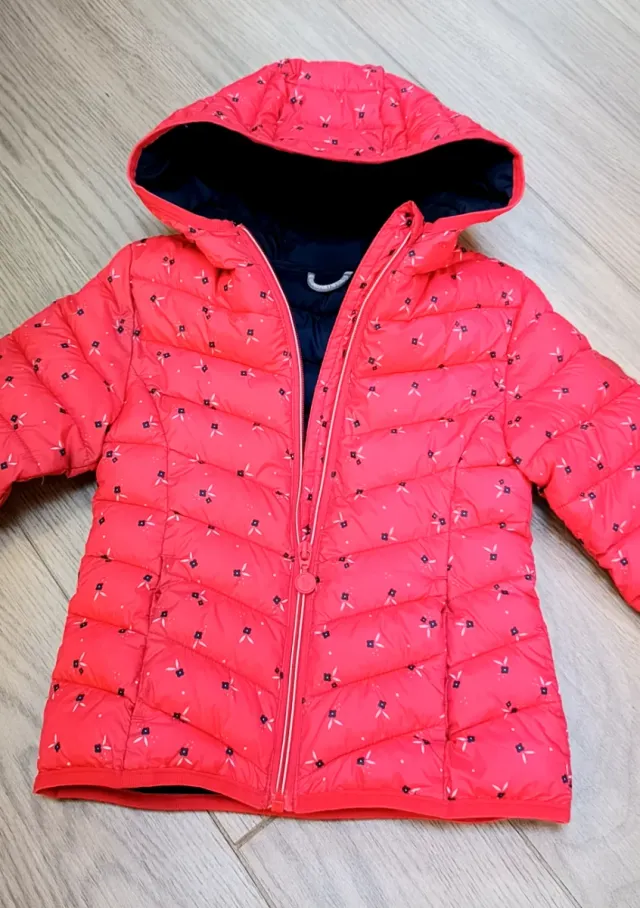 Bellissimo giubbotto per bambina, perfetto per le giornate più fresche. - Colore vivace rosso corallo. - Fantasia con piccoli fiori blu. - Cappuccio foderato. - Chiusura con zip.