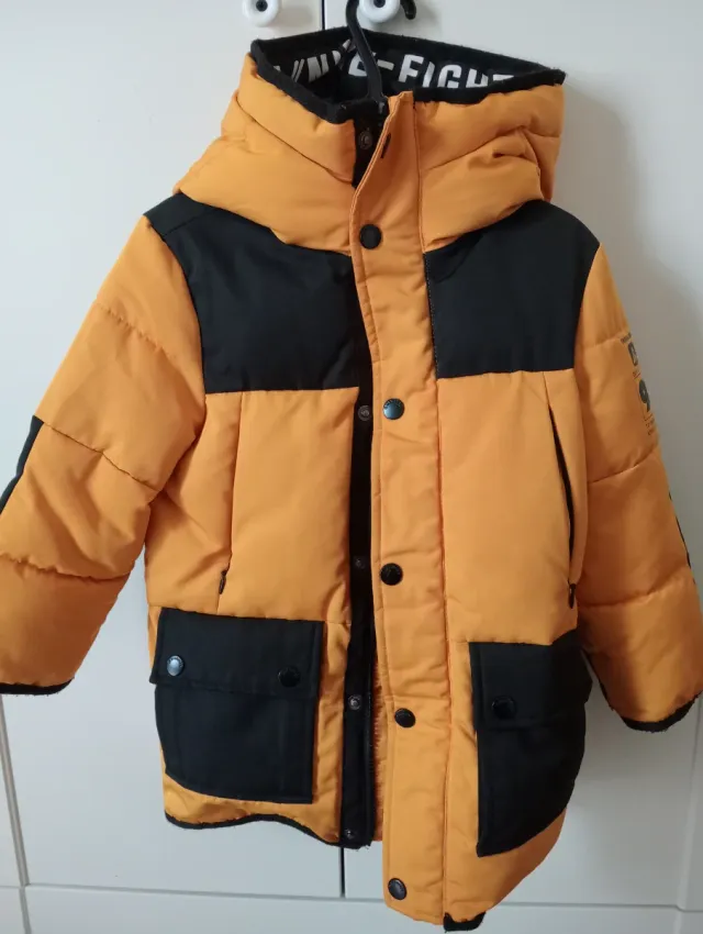 Giubbotto imbottito per bambini, taglia 3/4 anni. Colore giallo ocra e nero. - Cappuccio. - Chiusura con bottoni. - Tasche frontali con patta e bottone.