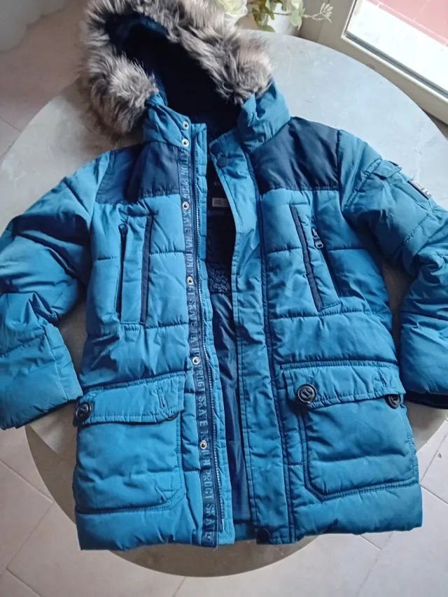 Caldo giubbotto invernale per bambino/a. - Taglia 9 anni. - Cappuccio con pelliccia sintetica. - Chiusura con zip e bottoni. - Tasche frontali con patta e bottone.