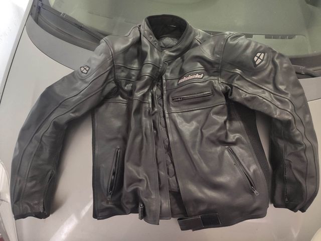 Dettagli del prodottoVendo fantastico giubbotto da moto in pelle, materiale pesante e protettivo, mai utilizzato. Misura XXXL, veste abbastanza stretto. Materiali di qualità, il capo è pesante ma nello stesso tempo altamente traspirante. In più è una produzione italiana, il che non guasta. Incluse nel prezzo protezioni gomiti e schiena (già inserite). Pagato 200€, vendo a 150€.