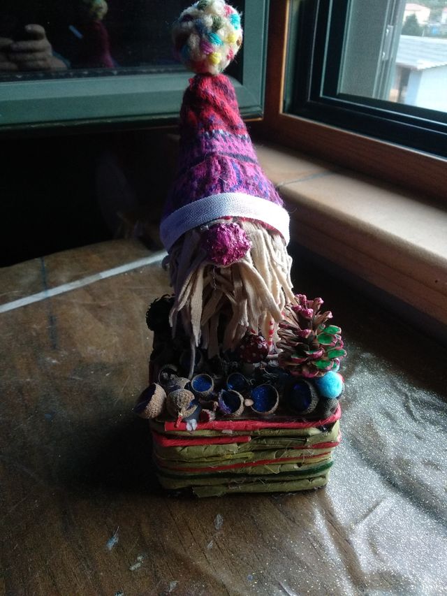 Dettagli del prodottoblocco in truciolare, corda, rafia, pigne, lana, feltro, glitter, boccioli rosa, ippocastano, pompon, ghiande, peperoncino in resina, gros grain, fibra fico d'India, colori acrilici e residui di smalto . tutto materiale riciclato.