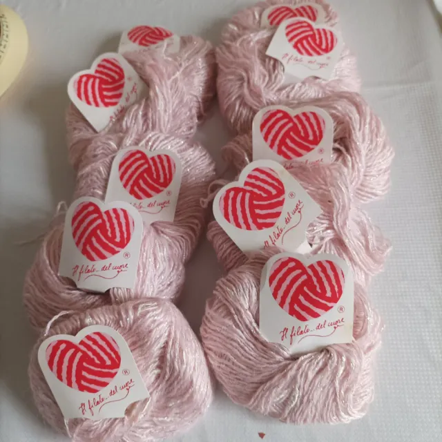 Dettagli del prodotto10 Gomitoli di lana color rosa con un filo metallico che dona un tocco di brillantezza da 50 gr cadauno.Perfetti per i tuoi progetti di maglia o uncinetto.