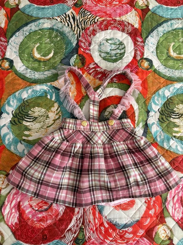 Gonna a quadri rosa e marrone per bambina. - Fantasia a quadri. - Bretelle con dettagli in pizzo. - Due bottoni dorati sul davanti.