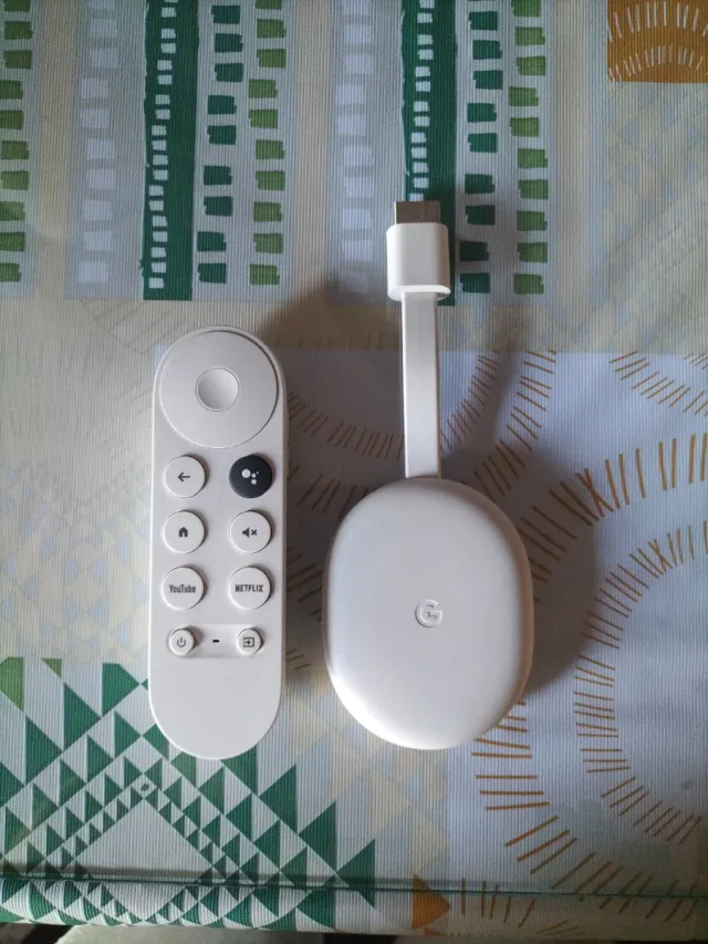 Dettagli del prodottoDispositivo di streaming Google Chromecast in bianco, con telecomando. Design ovale del Chromecast. Telecomando con pulsanti di navigazione e accesso diretto a YouTube e Netflix. Connessione HDMI e cavo HDMI. La descrizione è stata tradotta automaticamente.