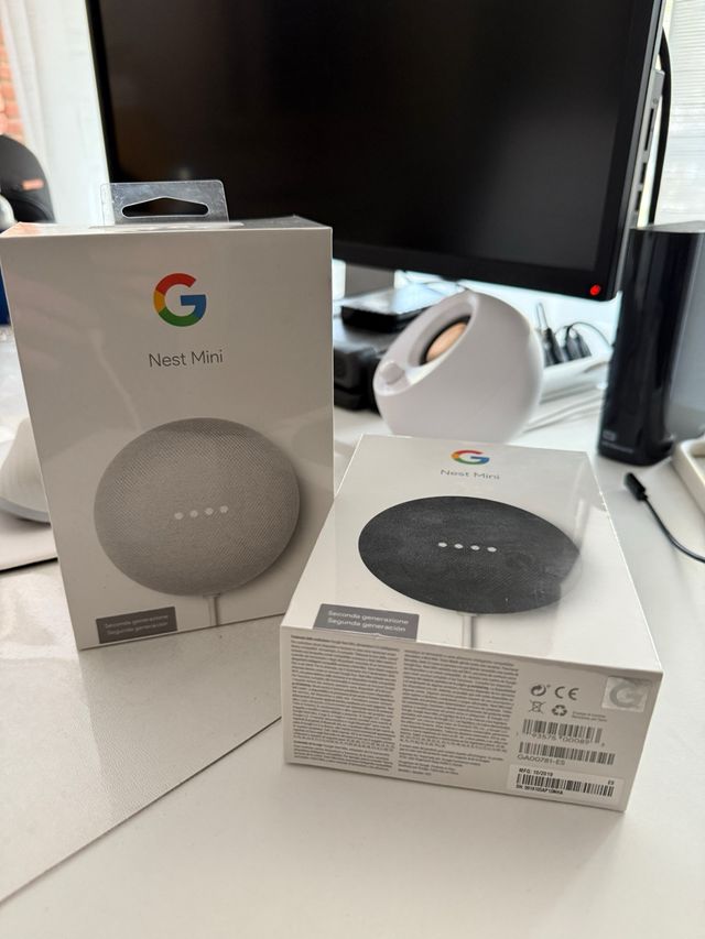 Dettagli del prodottoAltoparlante intelligente Google Nest Mini di seconda generazione. In colore grigio e bianco, compatto e con un design moderno. Nuovi e sigillati. 35€ per due, 20€ ciascuno. La descrizione è stata tradotta automaticamente.