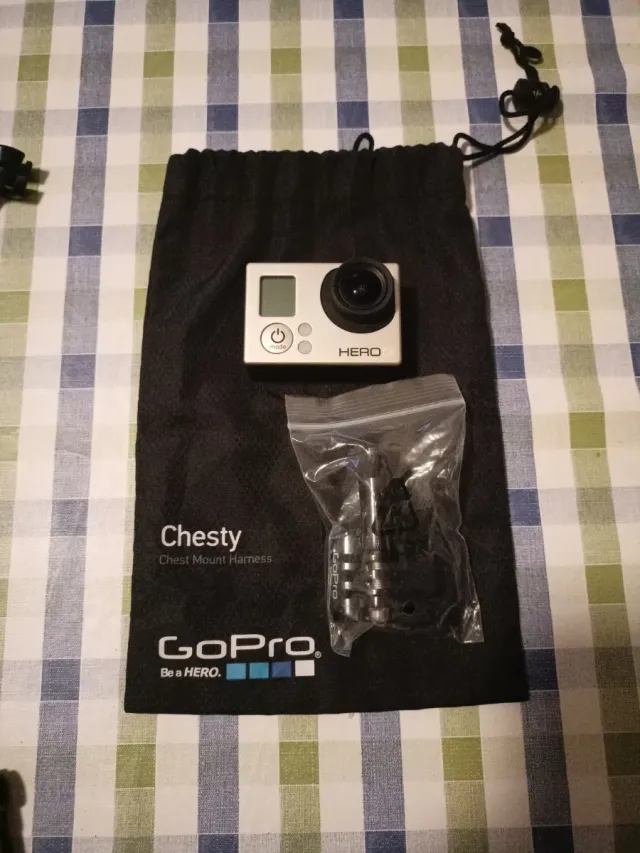 Fotocamera d'azione GoPro Hero 3. Funziona bene. Cavo incluso. Alcuni accessori inclusi, ma il prezzo è solo per la fotocamera.