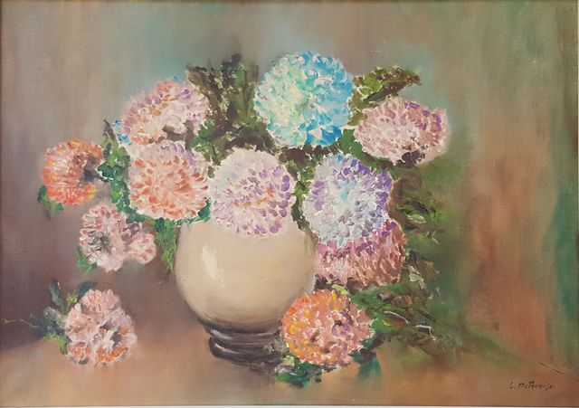 Dettagli del prodottoBella opera degli Anni '60 ad olio su tela, firmata in basso a destra, raffigurante un ricco vaso di ortensie colorate.