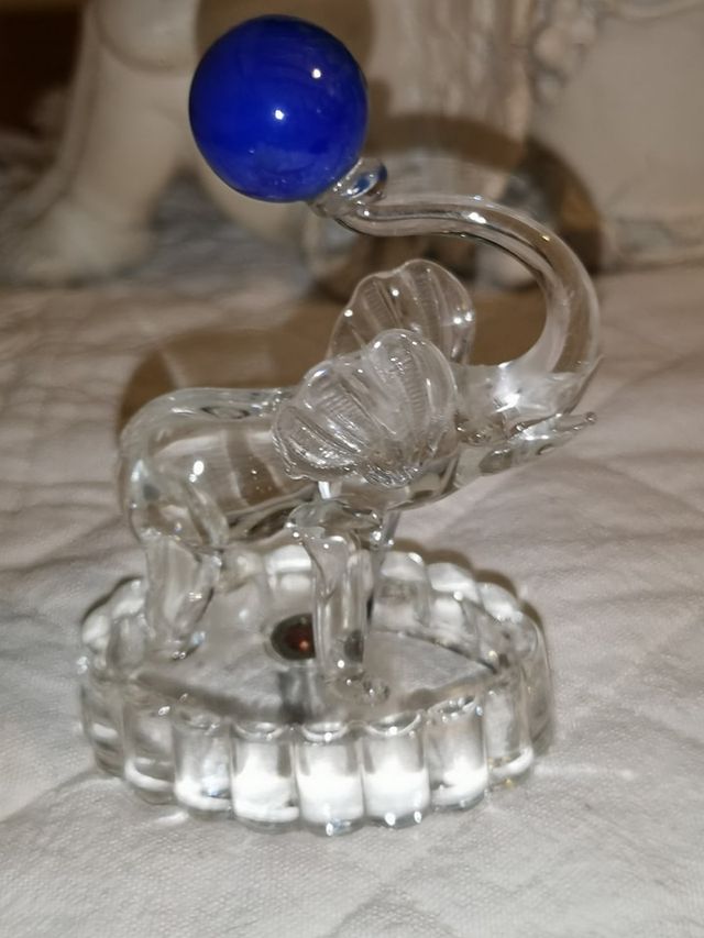Dettagli del prodottoGrazioso elefante con proboscide alzata portafortuna che sorregge una palla in vetro blu l'elefante poggia su una base sempre in vetro misura base 8x5 altezza cm 11 posso spedire SC41 1/2 #elefante #soprammobile #vetro #base