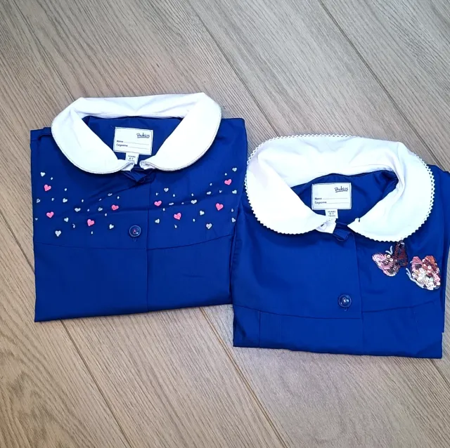 Dettagli del prodottoDue grembiuli da bambina di colore blu, adatti per la scuola.