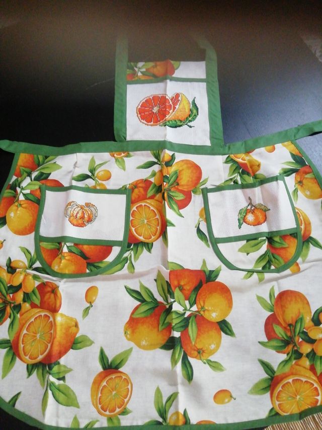 Grembiule con pettorina più presina, ricamato a mano a punto croce con tema arance, in cotone, mai utilizzati.