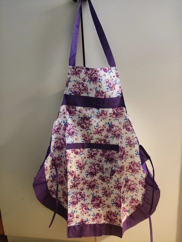 Grembiule in poliestere. Nuovo. Tirato fuori dalla confezione per fare la foto. colore bianco con fiori viola