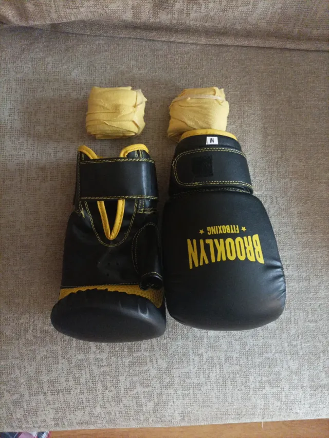 Set di guanti da boxe Brooklyn Fit taglia M, colore nero e giallo. Include fasce da boxe gialle.
