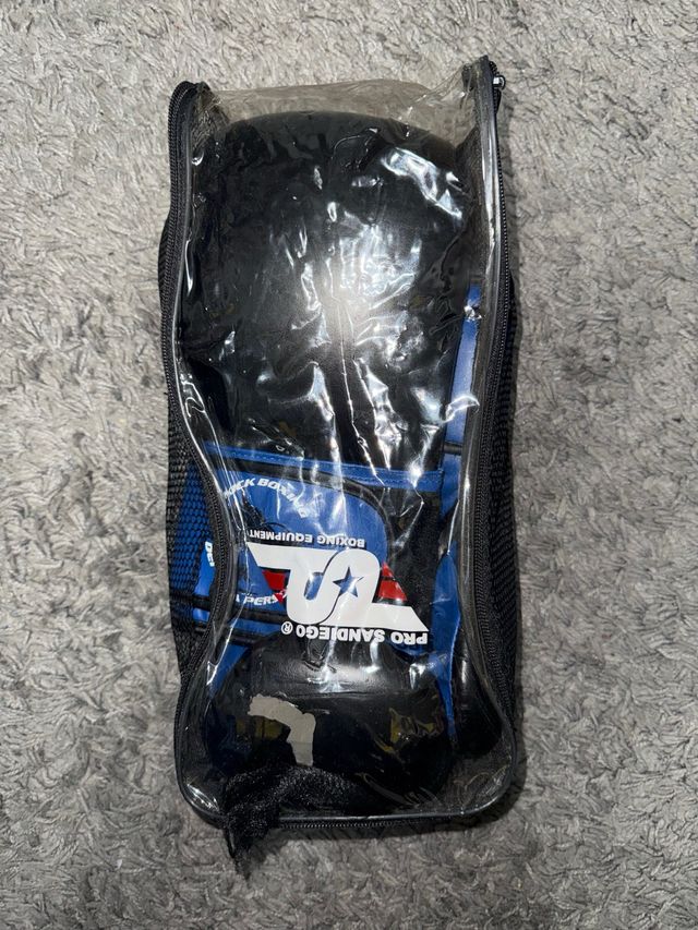 Dettagli del prodottoGuanti da boxe Pro San Diego nella loro borsa originale. - Usurati sulla punta - Colore nero e blu. - Include borsa da trasporto con cerniera. La descrizione è stata tradotta automaticamente.