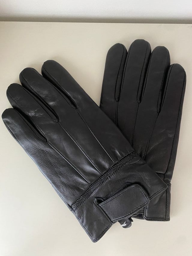 Guanti da uomo con strappo velcro, colore nero, in vera pelle, interno in pile, tg XL. Nuovi ancora legati insieme con laccetto in nylon.