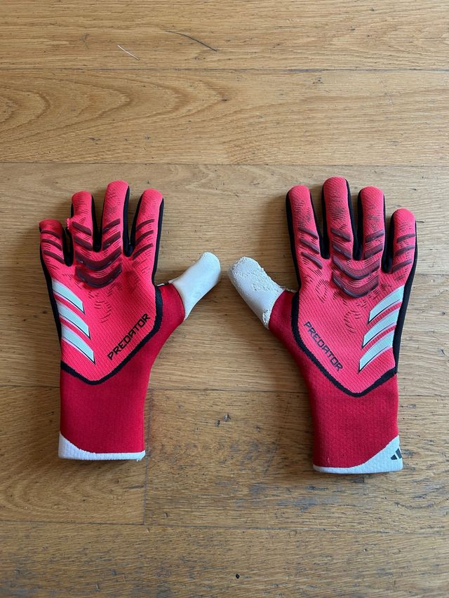 Guanti da portiere Adidas modello Predator. - Taglia 11. - Colore rosso e bianco. - Design con strisce Adidas laterali.