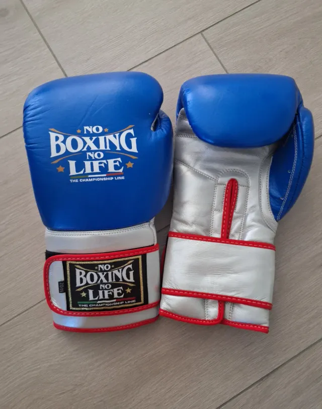 Guantoni da boxe professionali da 14 once, marca No Boxing No Life. - Replica. - Colore blu. - Pelle. - Chiusura in velcro.