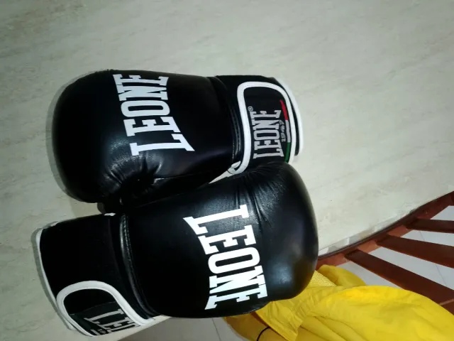 Guantoni da boxe Leone neri, ideali per allenamento e competizione. - Logo Leone stampato. - Chiusura in velcro. - Design ergonomico.