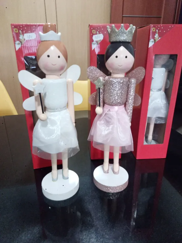 Dettagli del prodottoTre incantevoli fate di legno, due bianche e una rosa. Nella loro scatola. Per liquidazione di stock. 36 cm di altezza perfette per aggiungere un tocco magico alla tua casa. - Figure decorative in legno. - Design di fate con corona e bacchetta. - Ali bianche e rosa con glitter. - Basi bianche per esposizione. 10 euro l'unità. La descrizione è stata tradotta automaticamente.