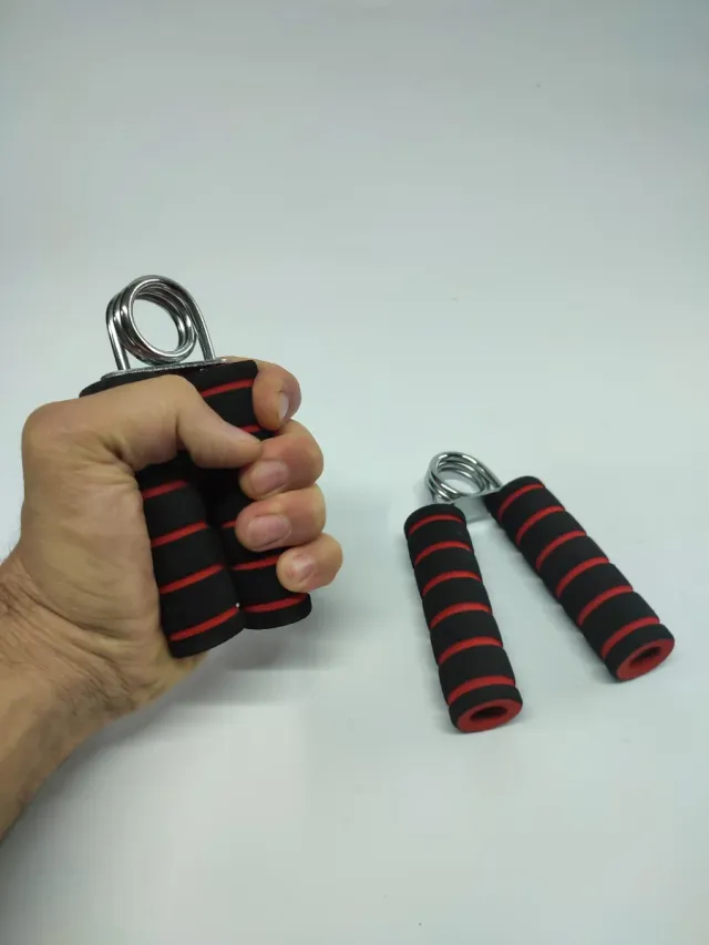 Set di impugna mani per allenamento. - Impugnature con rivestimento in schiuma nera e strisce rosse. - Molla in metallo resistente Usato poche volte, praticamente nuovo.