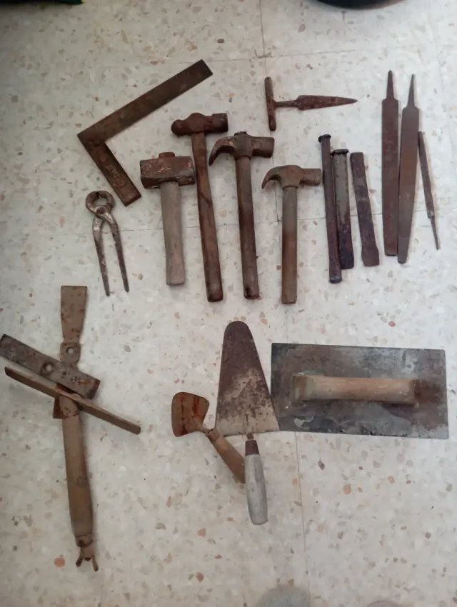 Set di strumenti da muratore antichi, ideali per collezionisti o per lavori di restauro. - Squadro in metallo. - Martelli di diverse dimensioni. - Scalpelli e punteruoli. - Pinze. - Palette e spatole.