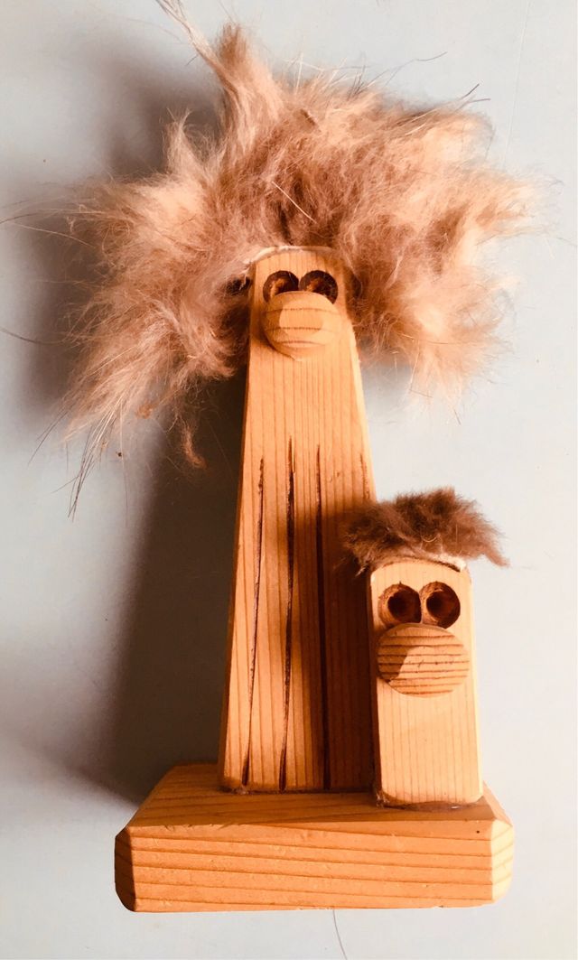 statuetta legno hobbit porta fortuna anni 80 fatta a mano legno e inserti pelliccia