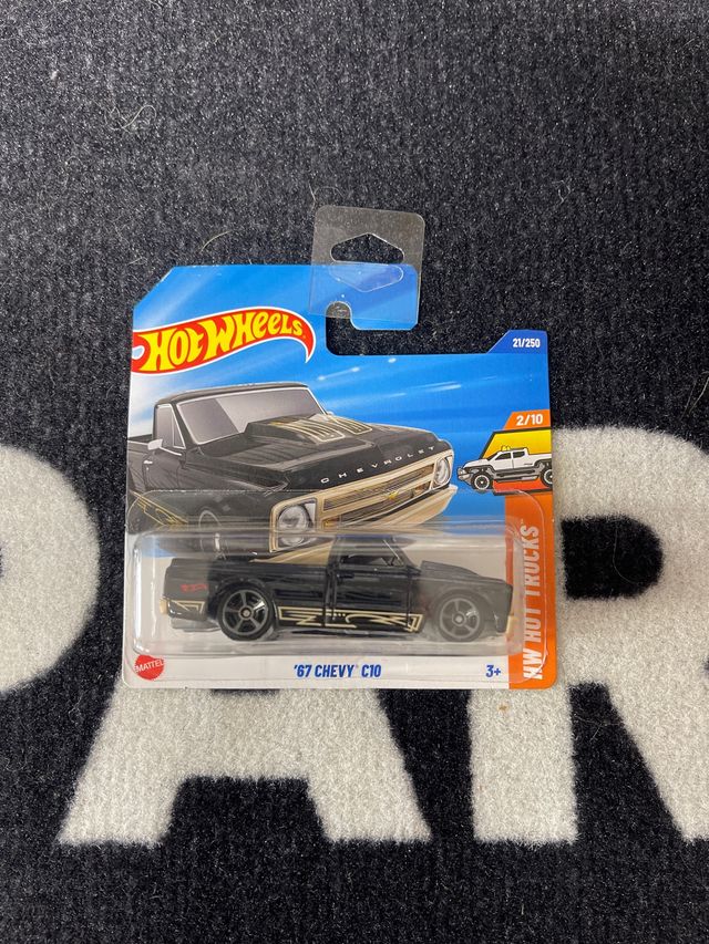 Modellino Hot Wheels della Chevrolet C10 del 1967. - Colore nero con dettagli dorati. - Parte della serie Hot Trucks.