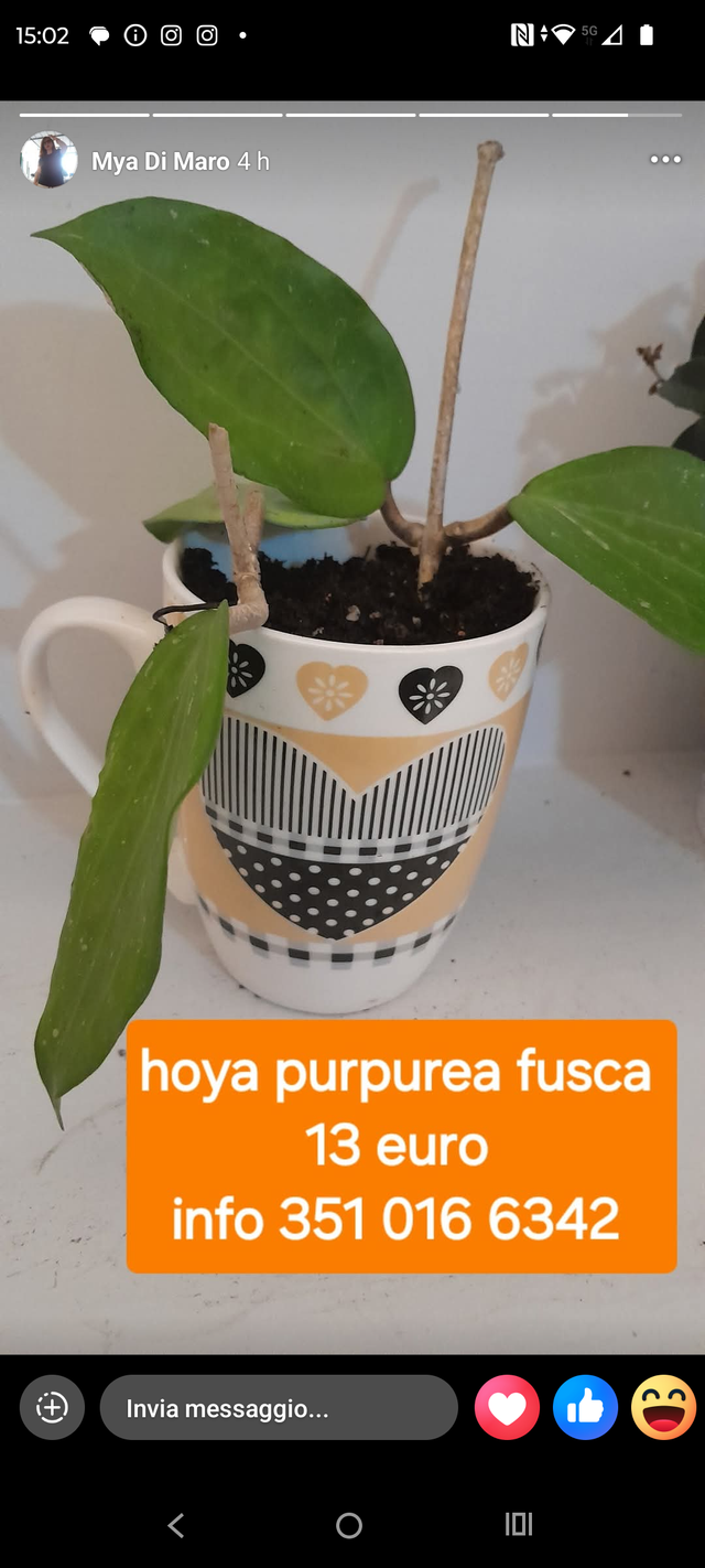 Pianta di Hoya purpurea fusca, presentata in una tazza decorata. - Prezzo: 13 euro. - Contatto per informazioni: 351 016 6342.