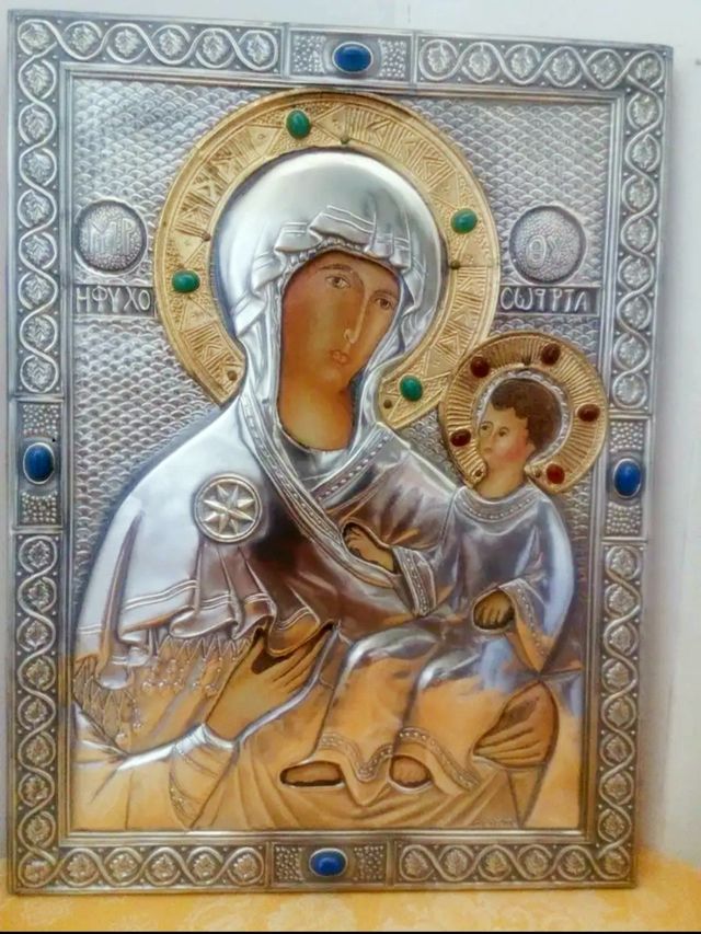Icona in argento con dettagli in bagno oro e pietre naturali