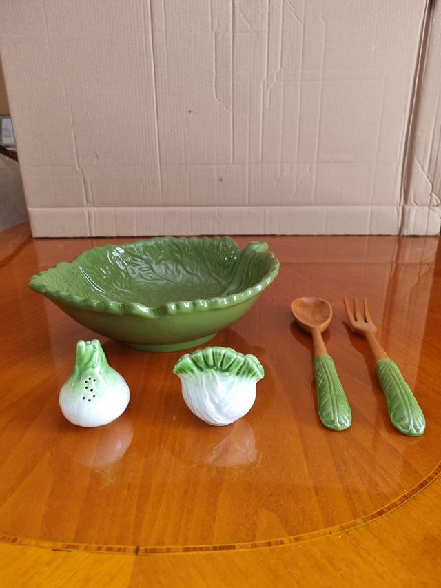 Dettagli del prodottoZuppiera a forma di foglia con venature in rilievo, in ceramica colorata. Completa di accessori. Vasetti per il sale e per il pepe a forma di ortaggi. Vintage. Originale anni settanta. Nuova, mai usata. Non ha difetti. Design molto particolare per la forma.