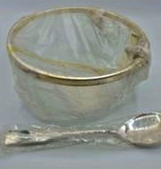 Dettagli del prodottoCome da foto vendo insalatiera con bordo e posate in argento, ciotola in vetro massiccio, marca Sheratonn.