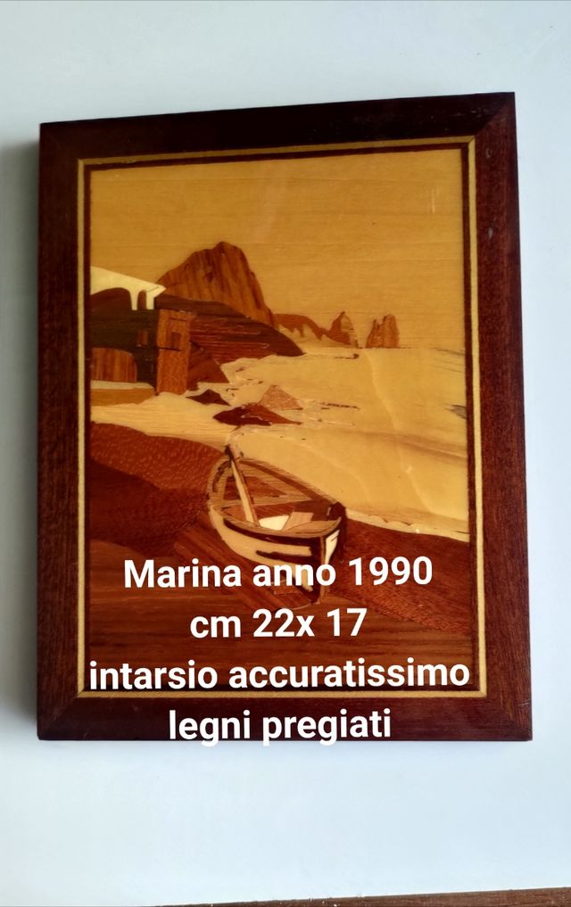 Dettagli del prodottoBellissimi intarsi in legno, raffiguranti scene marine. Sono realizzati con legni pregiati e mostrano un'accuratezza notevole nei dettagli. Vendo 5 quadri in blocco a 90 € oppure singolarmente a 30 euro ciascuno pannello a scelta.